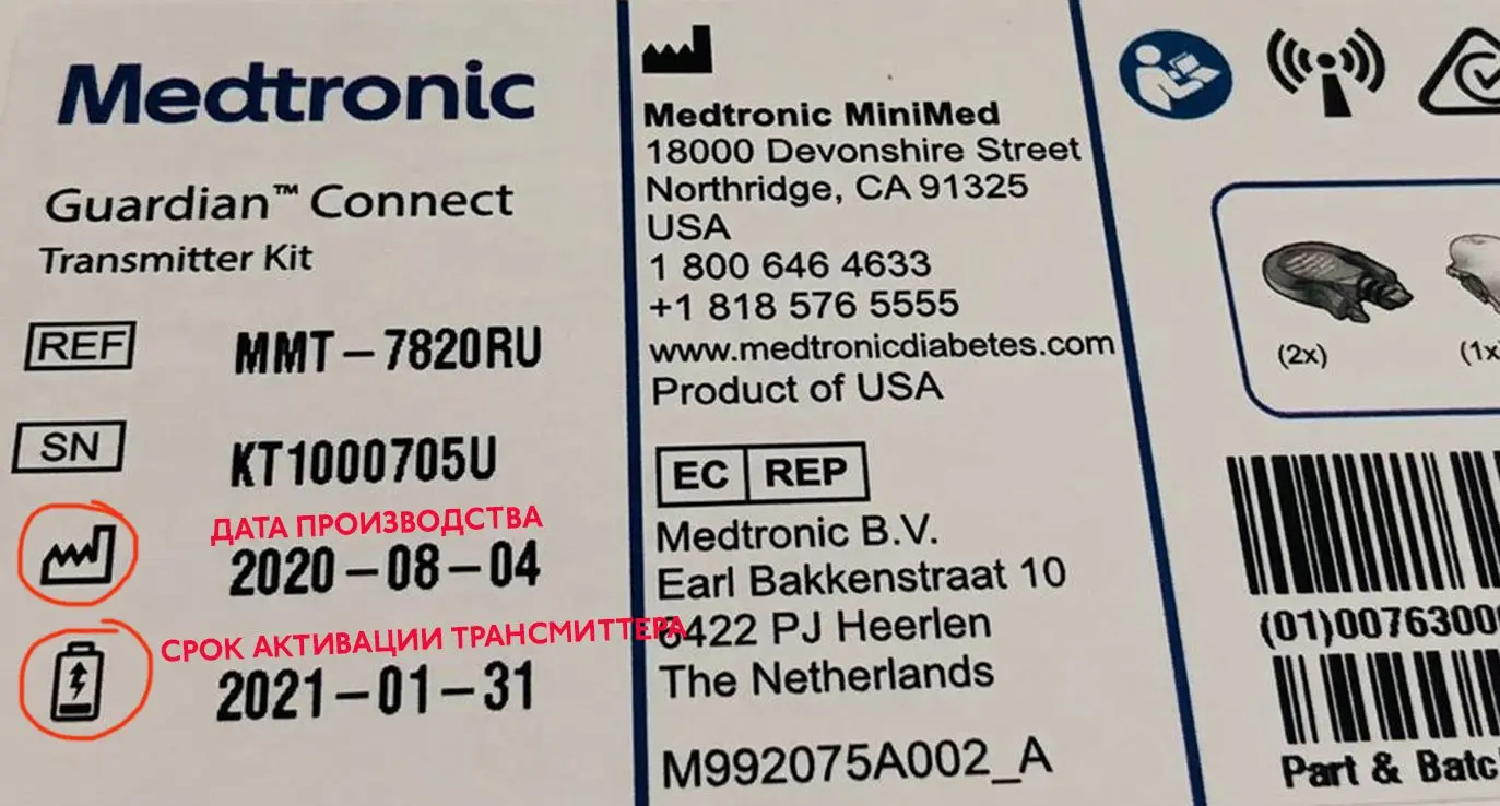 - вторая (помечена значком батарейки) - крайняя дата рекомендованного срока активации трансмиттера.