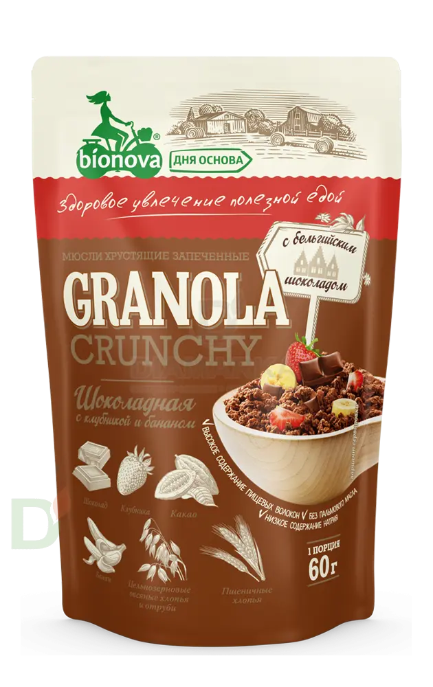 Мюсли Bionova Шоколад-Клубника запеченные хрустящие, 60г